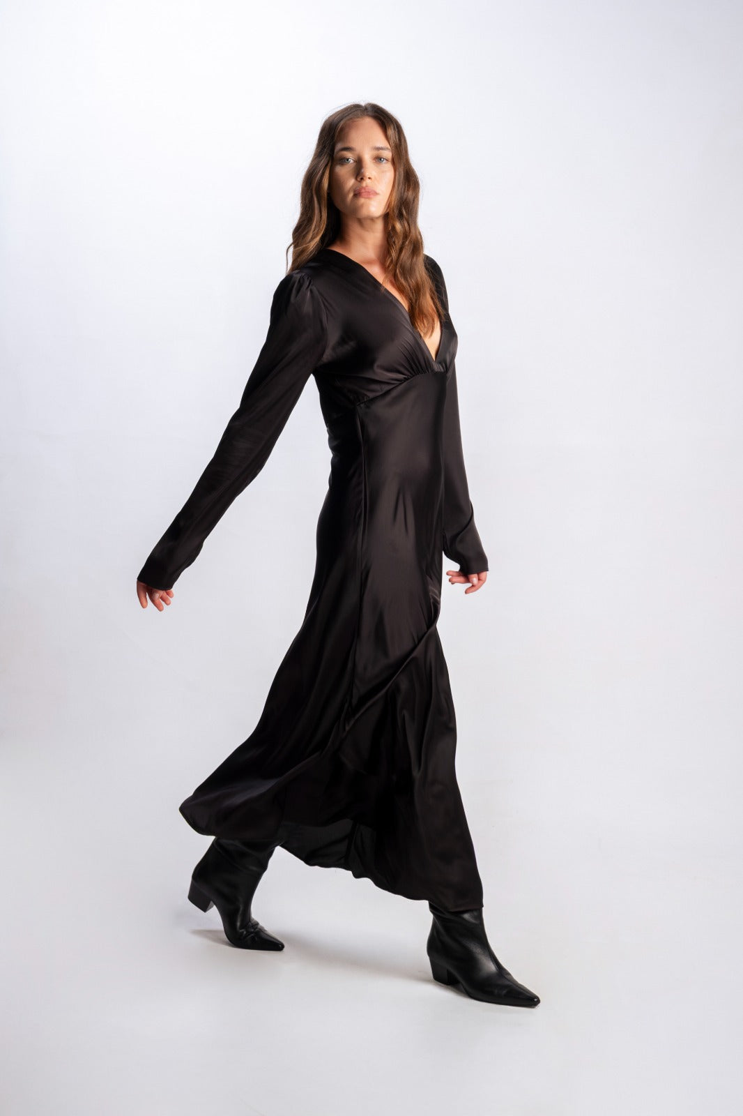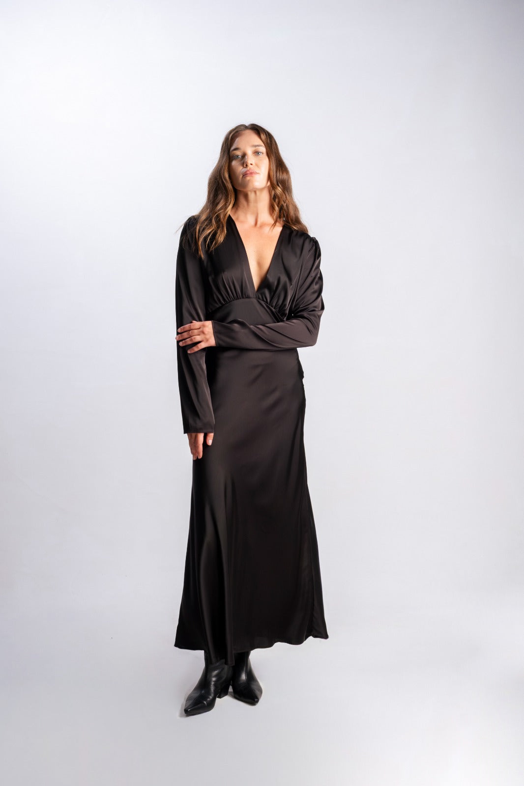 A modern ode to elegance. Crafted from viscose satin, the Daynight Dress flows effortlessly with every movement. Its refined silhouette transitions seamlessly from day to evening, embodying a quiet confidence and timeless allure.