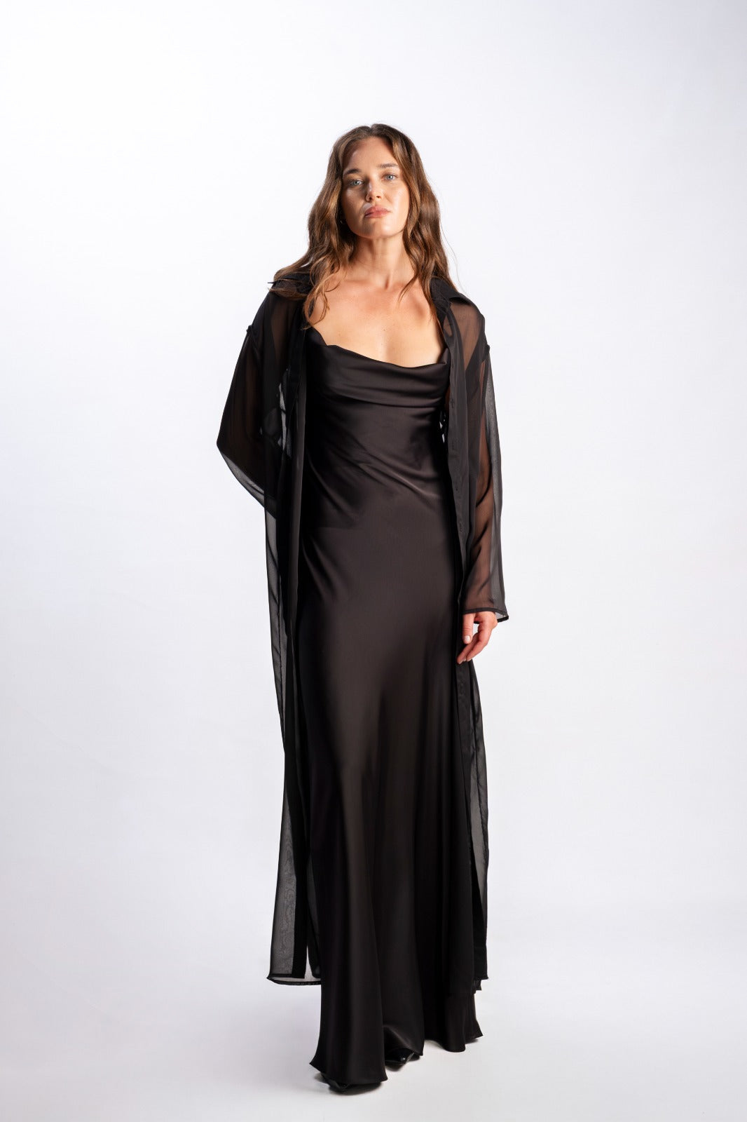 Crafted from sheer, weightless chiffon, it drapes effortlessly over the body, adding a layer of mystery and refinement. Perfect for layering over silk gowns, Lumière is the ultimate expression of understated allure.