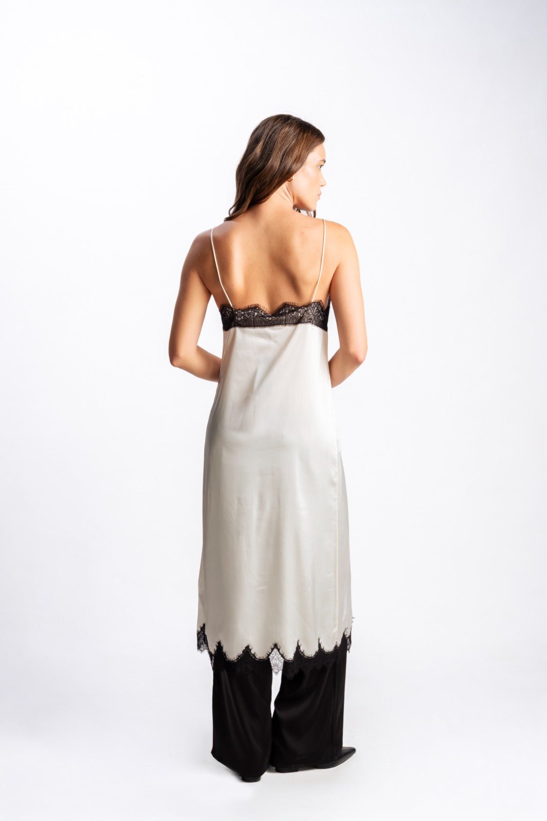 Where romance meets edge. The Muse Dress features a soft satin body framed by delicate scalloped detailing, blending modern sensuality with timeless grace. A piece that captures effortless femininity in every step.